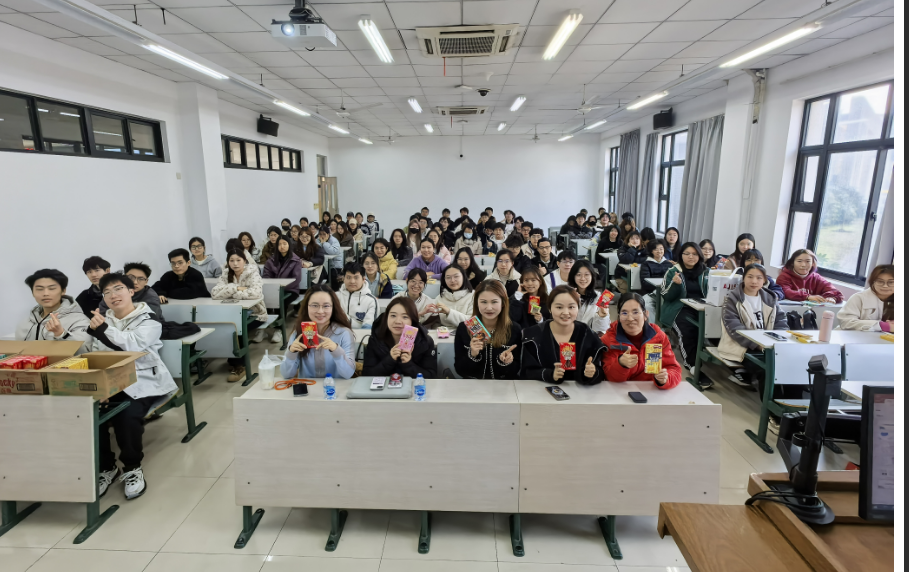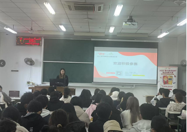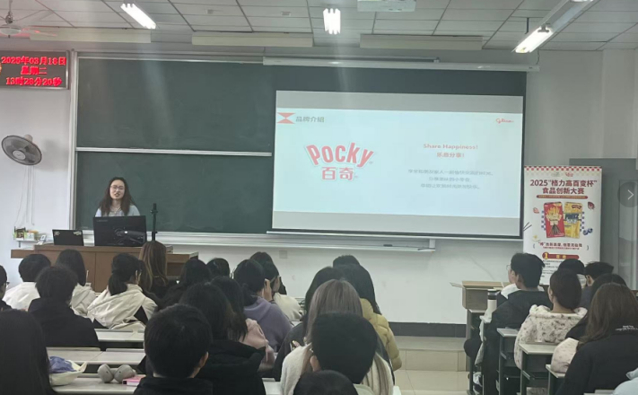 格力高的三位老师为现场师生介绍了格力高集团的历史与产品研发、“百奇”与“百力滋”的品牌理念、产品介绍等企业文化,并从企业角度出发讲解期待学生们能做出什么样的产品,为同学们的参赛方向做出指导。然后,为了让同学们更好地了解大赛,去年的获奖同学代表吴琴同学给大家分享了她们的作品“大豆酸奶冰淇淋”的参赛经验,她从最初的创意来源、计划书撰写到后期的产品制作等方面分享了她的想法和建议。