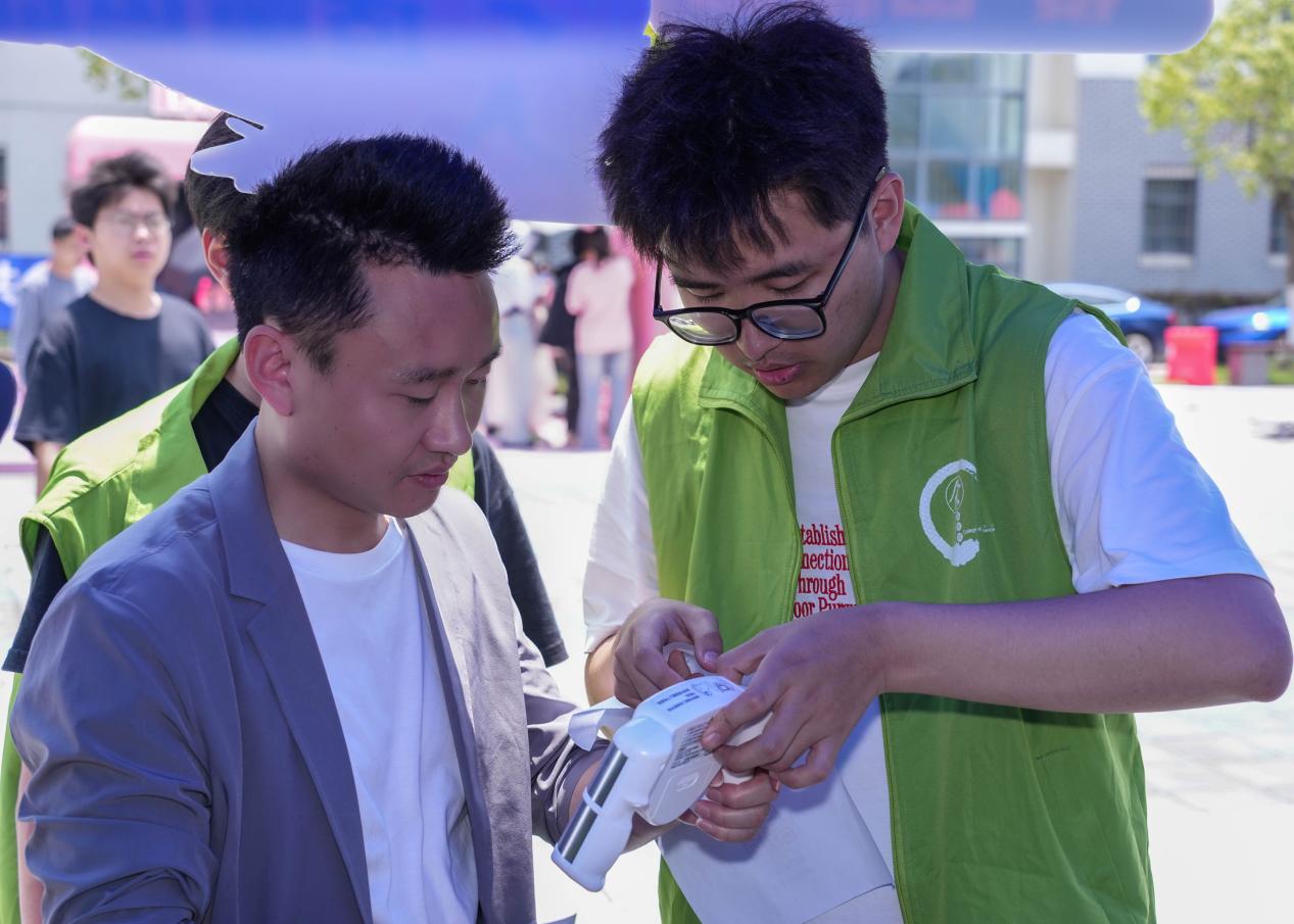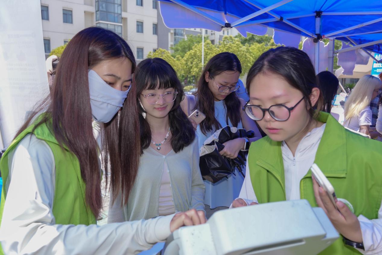 活动核心亮点三:“个性化减重咨询区”提供了更为精准的健康体重管理服务。该区域旨在帮助学生摆脱减肥“盲目期”,依据科学数据制定适合自己的健康管理路径。学校体育部为本次科普活动提供了专业的体重体脂检测设备,营养专家现场为学生进行体重指数、体脂率等检测及分析,并依据详尽的体测报告数据,面对面解读身体状况,指出个体化的饮食结构误区,提供针对性的膳食改善建议和运动方案参考。现场同时发放了由上海市营养学会制作的《知食 善食 健康体重》主题科普手册。因其图文并茂、通俗易懂的科普内容成为现场的“抢手货”,为学生后续自我健康体重管理提供了科学的参考指南。